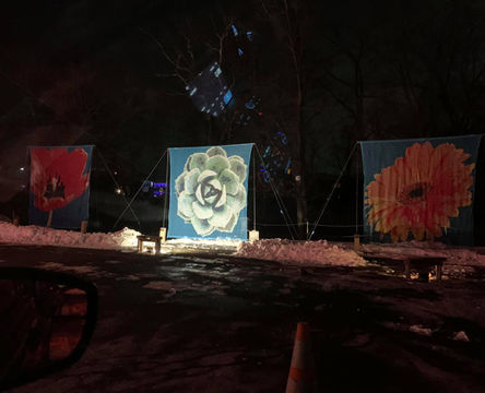 This is not your grandmother's needlework. This is large scale translucent tapestry made with craft yarn on an open weave that's as big as the trees. This is Kris Campbell Art.